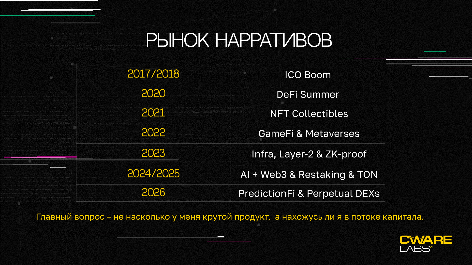Мы в Cware Labs видели ситуации, когда технически слабый проект закрывал раунд просто потому, что попал в нарратив. И видели обратное – сильные команды с хорошим продуктом не могли привлечь деньги, потому что шли против текущего потока внимания. Это не всегда справедливо, но это реальность рынка.