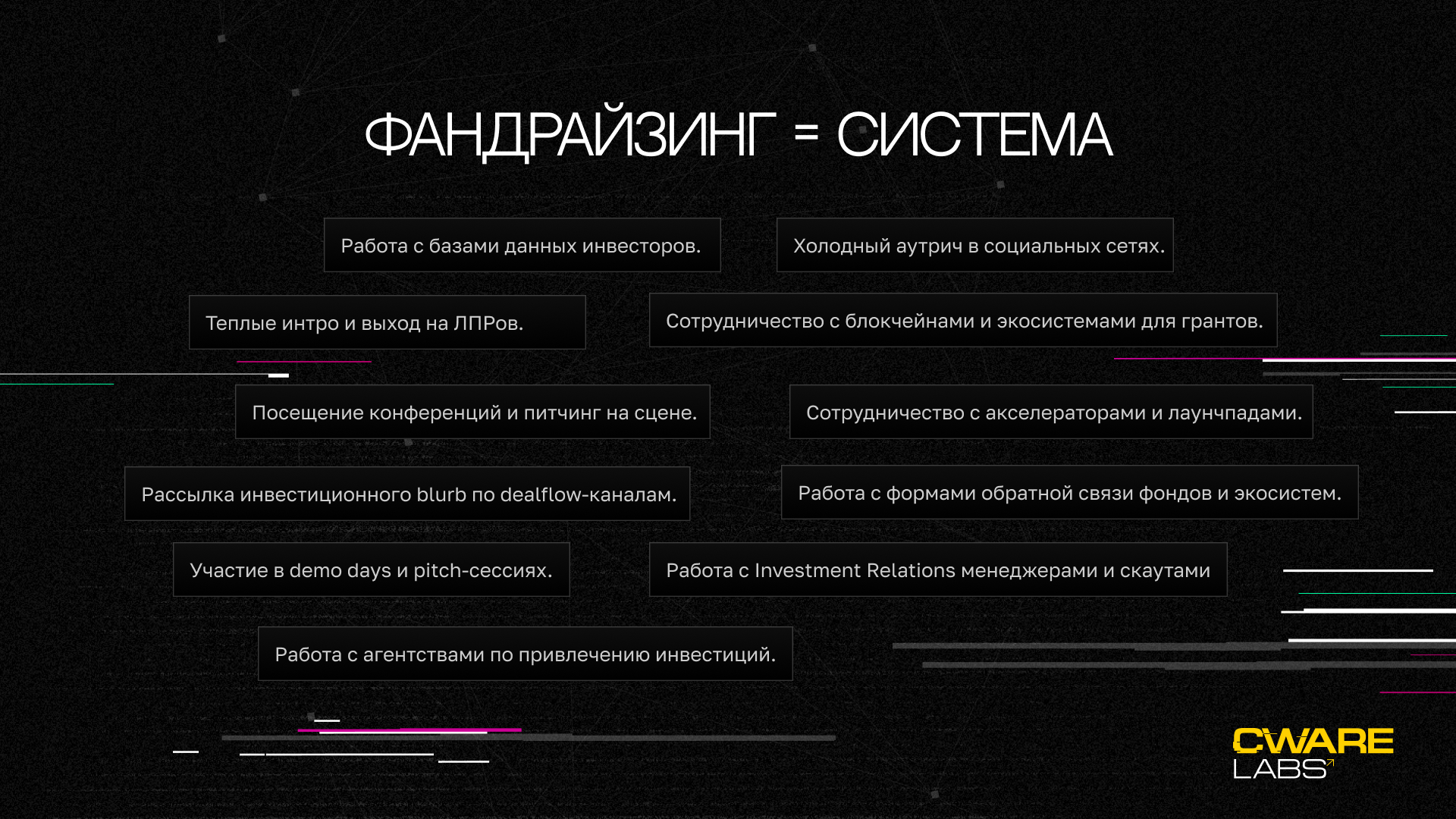 Теперь о самом главном. Все, о чем мы говорили выше, имеет смысл только как часть единой системы. Привлечение инвестиций в Web3 и AI – это не событие. Это процесс, который включает несколько параллельных направлений работы.